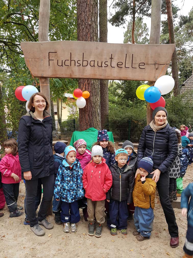 Der KITA fehlte es nun noch an weiteren Brettern und Fließbahnen in verschiedenen Längen zur Erweiterung der Fuchsbaustelle. Aufgrund der Absage der Gemeinde Michendorf für weitere dezentrale Spielgeräte im Birkenwäldchen hatte der Kinder-Kinder Förderverein e.V. noch Fördergelder der Mittelbrandenburgischen Sparkasse in Höhe von 2.000 Euro zur Verfügung, die ursprünglich für Spielgeräte im Birkenwäldchen vorgesehen waren. Dank der Möglichkeit diese Förderung umzuwandeln, konnte der KiKiVe der KITA Ameisenhügel nunmehr den großen Wunsch erfüllen und die Erweiterung der Fuchsbaustelle ermöglichen. Am 26. Oktober 2018 konnten die Vorsitzende und die stellvertretende Vorsitzende des KiKiVes die Bausteine feierlich übergeben. Die „Fuchsbaustelle“ wurde eigens hierfür durch die KITA festlich geschmückt und die Geschenkpakete waren mit hübschen Schleifen verziert. Die Aufregung der Kinder, als Ulrike Zoschke und Karin Buchholz um 10 Uhr zur feierlichen Übergabe auf dem Spielplatz der KITA erschienen, war ungebremst. Die Kinder waren kaum noch zu halten und die Freude so riesengroß, dass nach kurzen Worten endlich die Pakete aufgerissen wurden. Mit Spaß und unaufhaltsamer Begeisterung fingen die Kinder sofort an, die neuen Bretter und Fließbahnen mit den vorhandenen Teilen zu kombinieren. Die Kreativität war dabei grenzenlos. Und auch die großen Pappkartons wurden gleich in Beschlag genommen und zum Versteckspiel wiederverwendet.