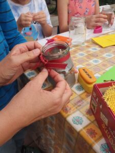 inspirierte uns zu einem Bastelangebot für Kinder, bei dem besonders schöne Erntegaben wie Kräuter und Zweige für das Verzieren von Marmeladengläsern als Windlicht eingesetzt werden konnten.