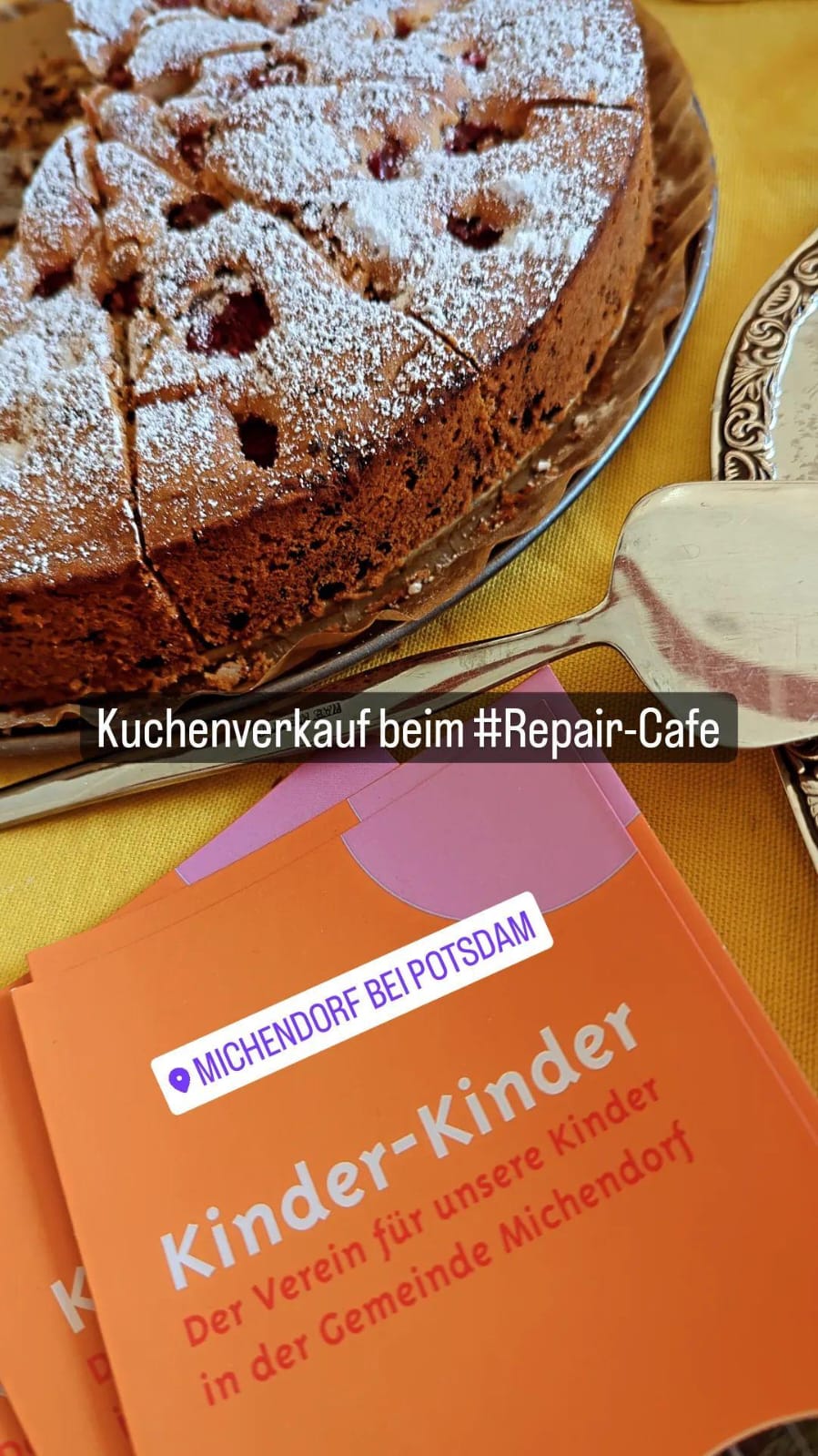 Am Dienstagnachmittag kam die Anfrage aus der Gemeinde Michendorf, ob wir das erste Michendorfer Repair-Café am Samstag mit einem Kuchenstand unterstützen könnten. Obwohl die Vorstandsmitglieder für den Samstag selbst alle verhindert waren, starteten wir einen entsprechenden Aufruf in unserer Kikive-Aktiv-Gruppe und tatsächlich: die sechs erbetenen Kuchen und die Standbetreuung waren schnell zugesagt.