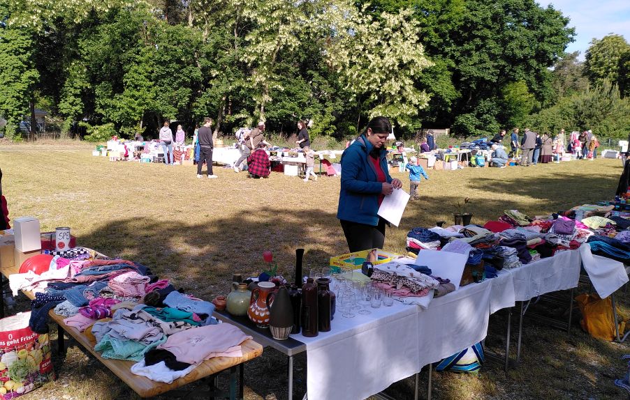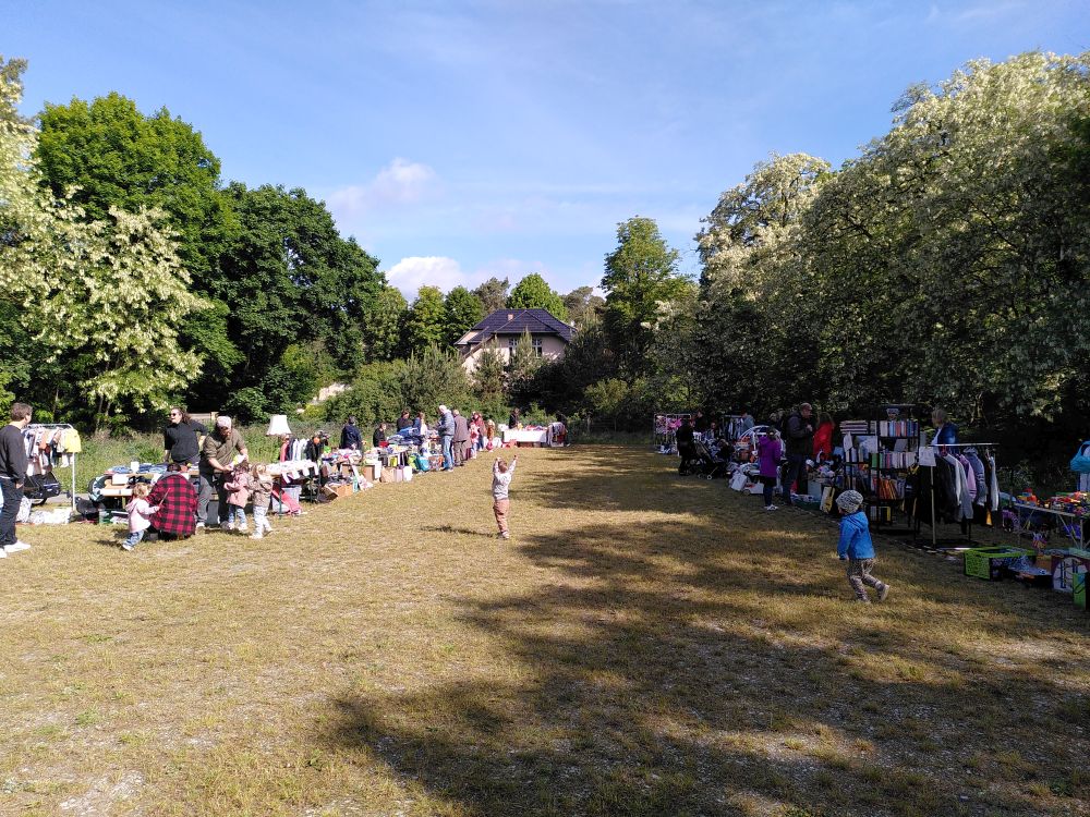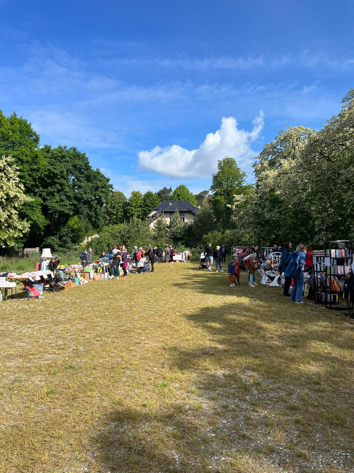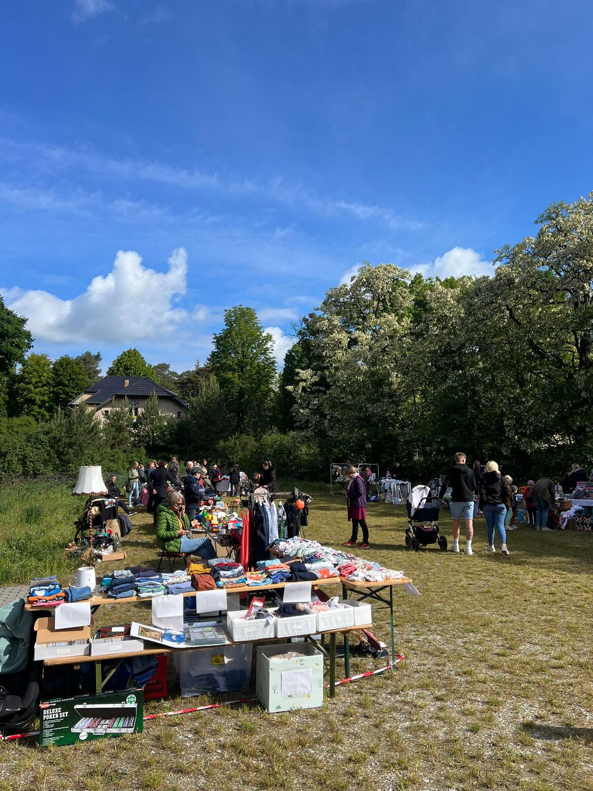 Auch wenn die Regentage im Mai von vielen herbeigesehnt wurden, so hatten wir uns für unseren Flohmarkt doch besseres Wetter erhofft – und hatten richtig Glück. Trotz Regen am Vortag ein gut abgetrockneter Boden auf dem Gelände „Neue Mitte Wilhelmshorst“, viel weniger Wind als an den Tagen zuvor und sogar warme Sonnenstrahlen, die zusätzlich zum bunten Angebot an den circa 30 Ständen gute Laune machten.
